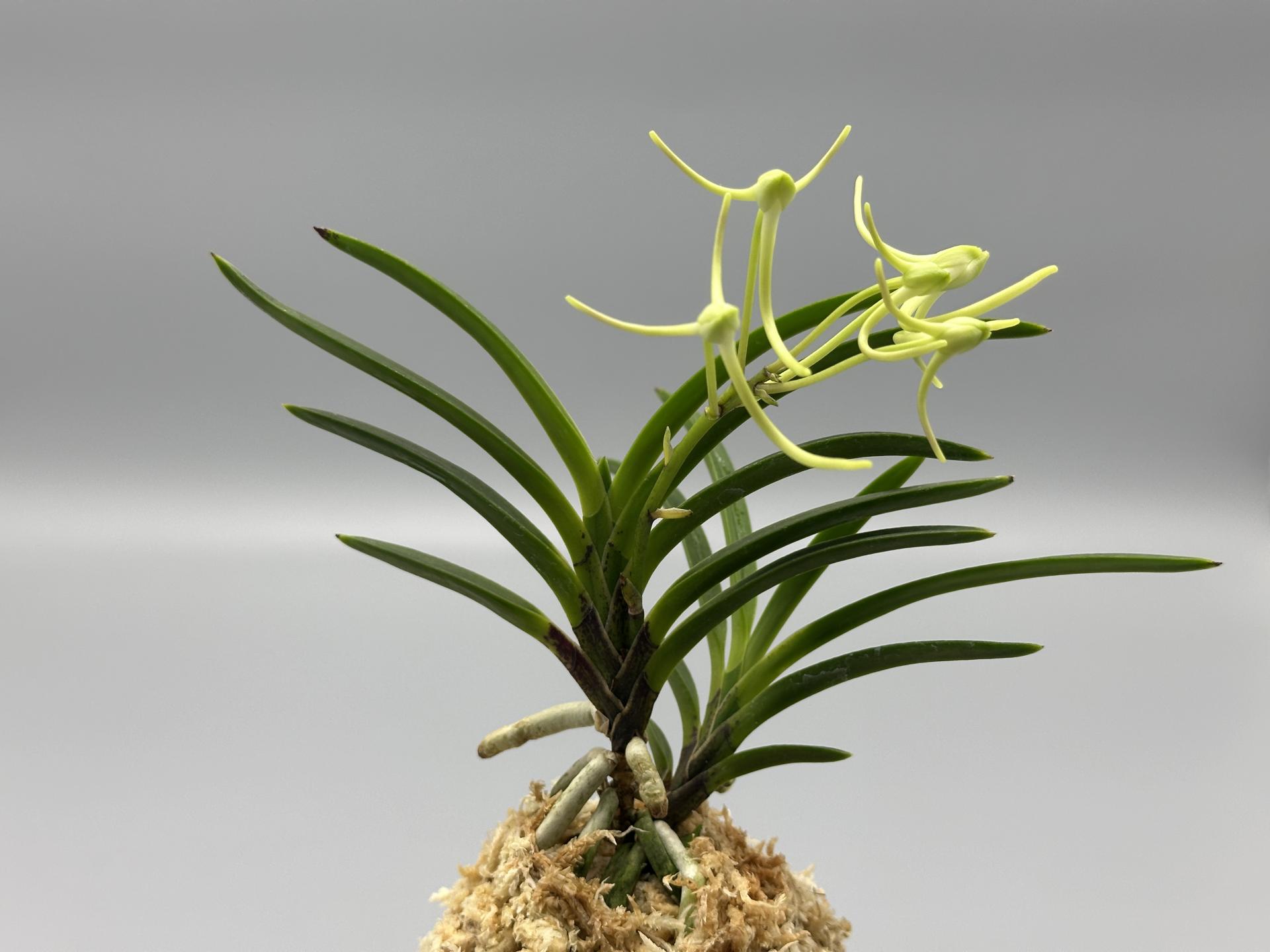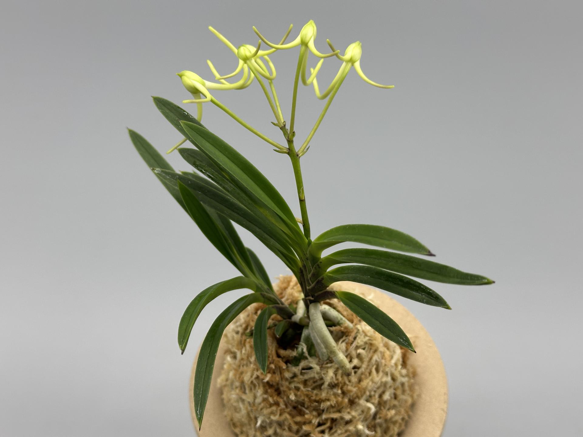 韓國에서 보통의 아마미 풍란 실생에서 선별된 것으로, 한 주(株)만이 꽃 변이된 것이다. 아마미계이지만 중소형으로, 잎은 약간 좁으며 입엽성이다. 꽃은 2개의 화변(봉심)이 설화(舌化)되어, 설에 붙어 있는 거(距)가 3개인 삼접(三蝶) 피기로, 화변(주, 부변) 끝에 연녹색을 올린다. 또 하나의 특징은, 거가 약간 짧아 많이 휘어지지 않고, 화변이 둥글며 넓고 짧다는 것이다. 더더욱이 하늘 피기로 단정하고 힘찬 모습이 돋보이는 난이다. 한국풍란연합회 등록 2호로 2006년에 등록되었다. 니축에 니근으로, 붙음매는 옅은 파형이다. |