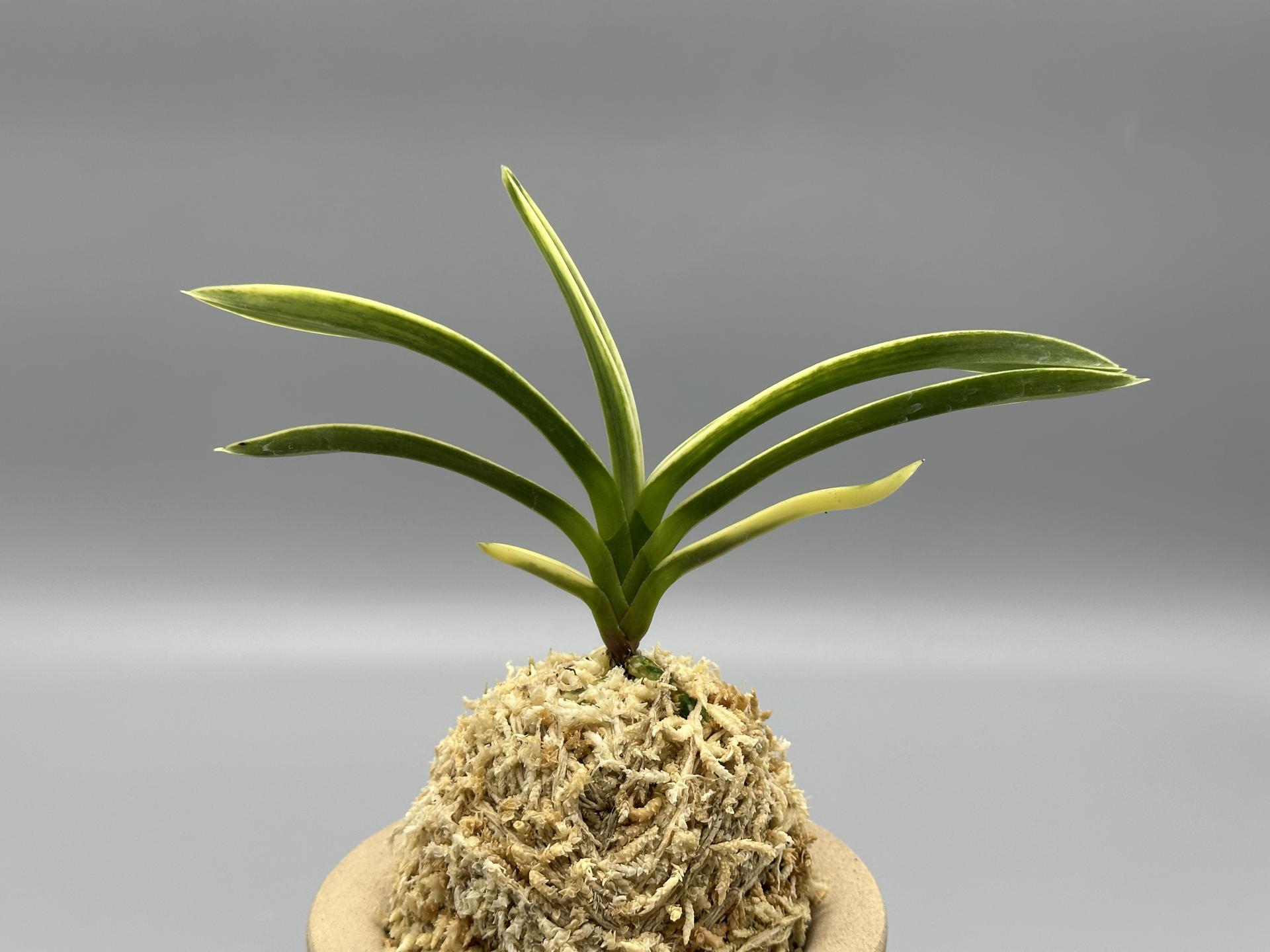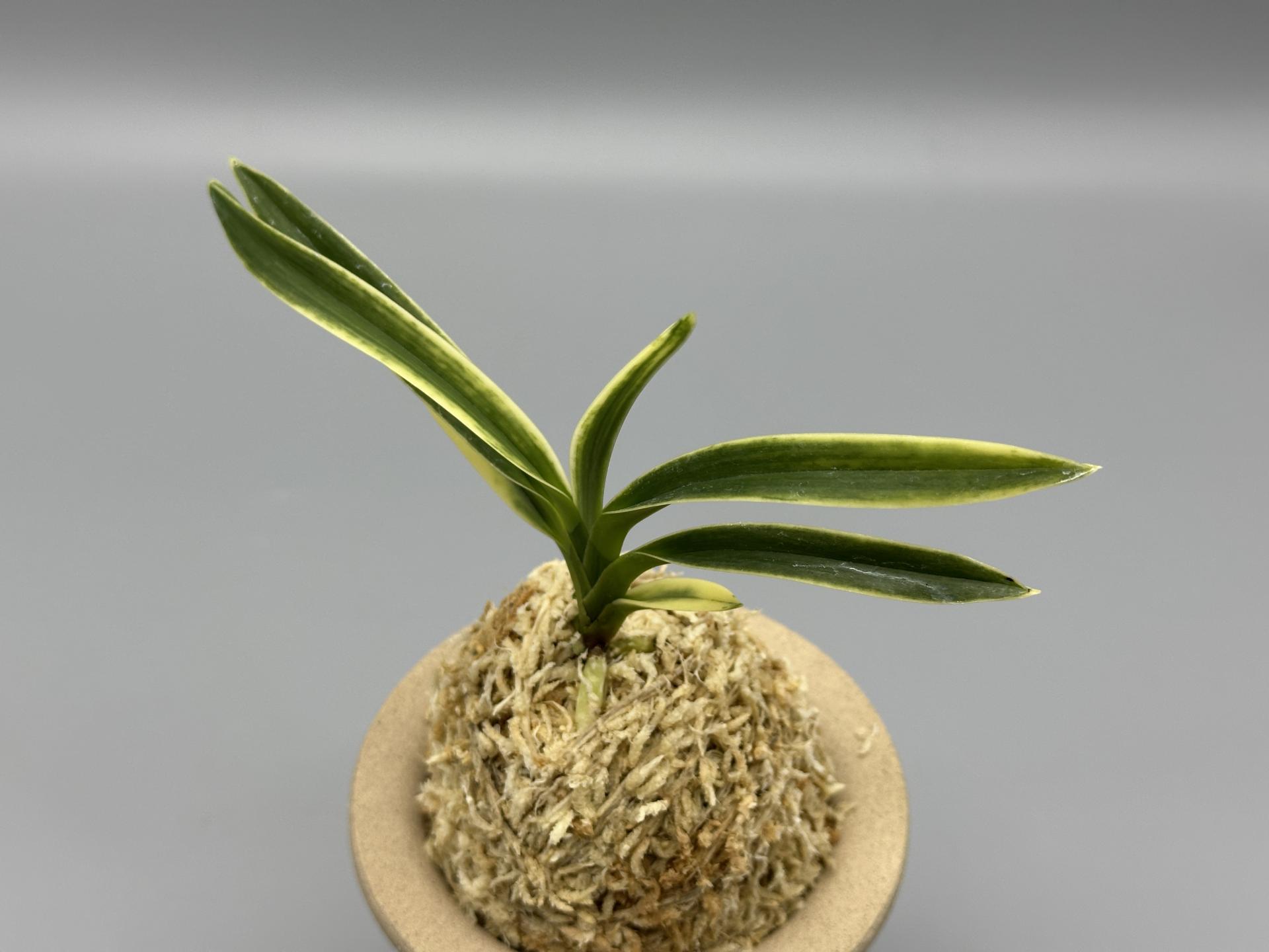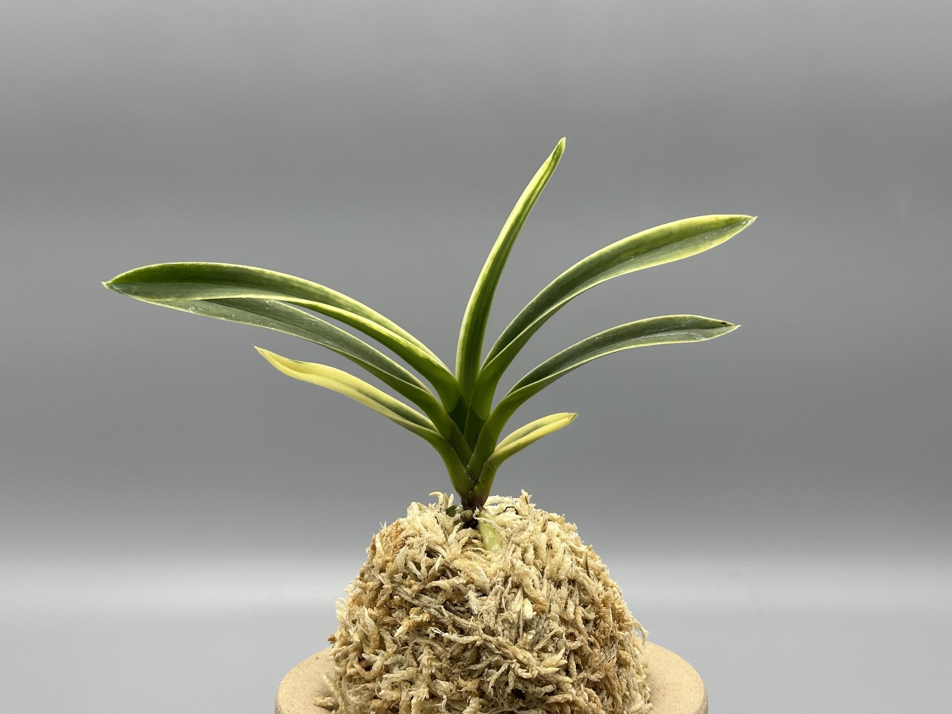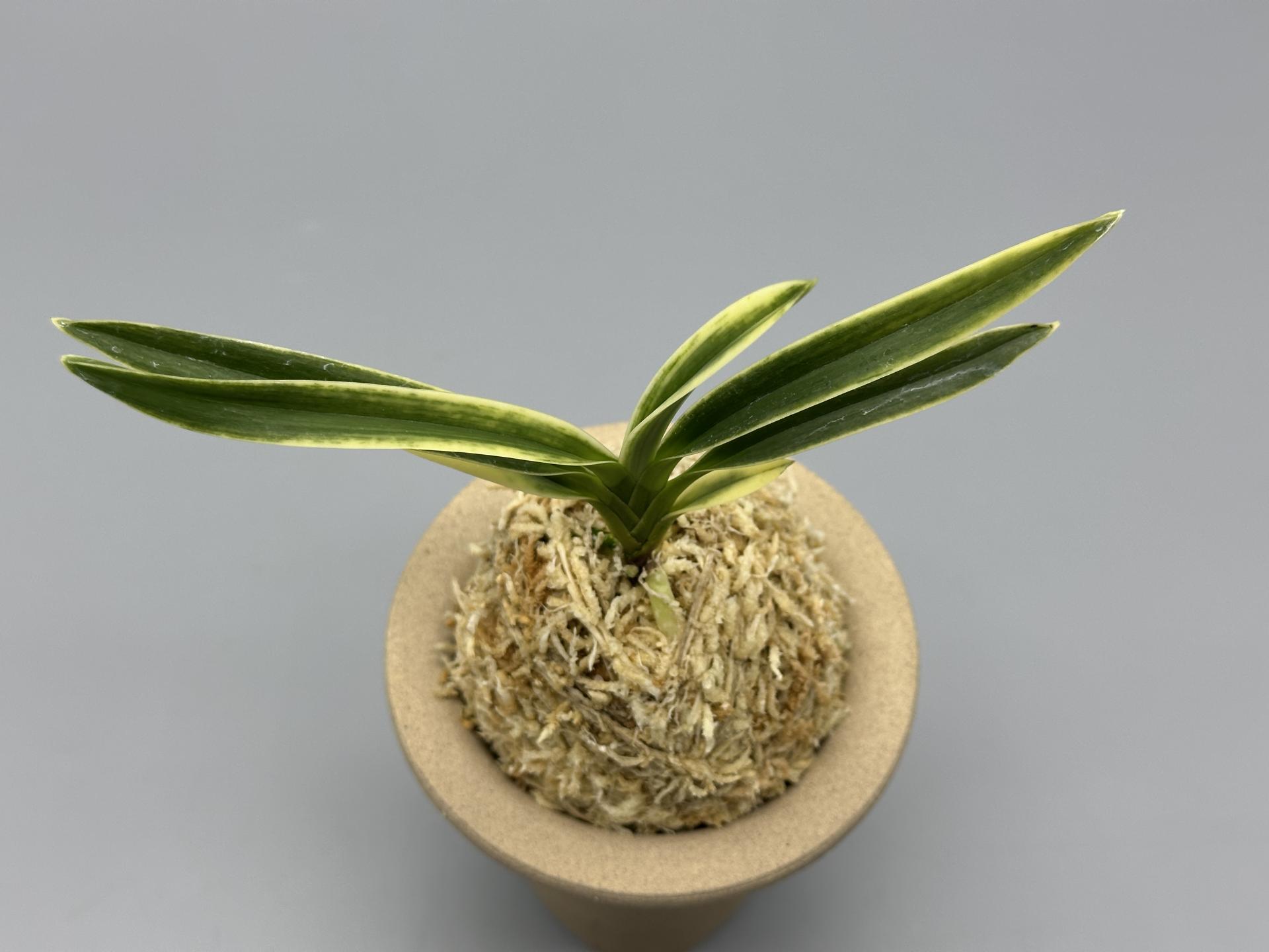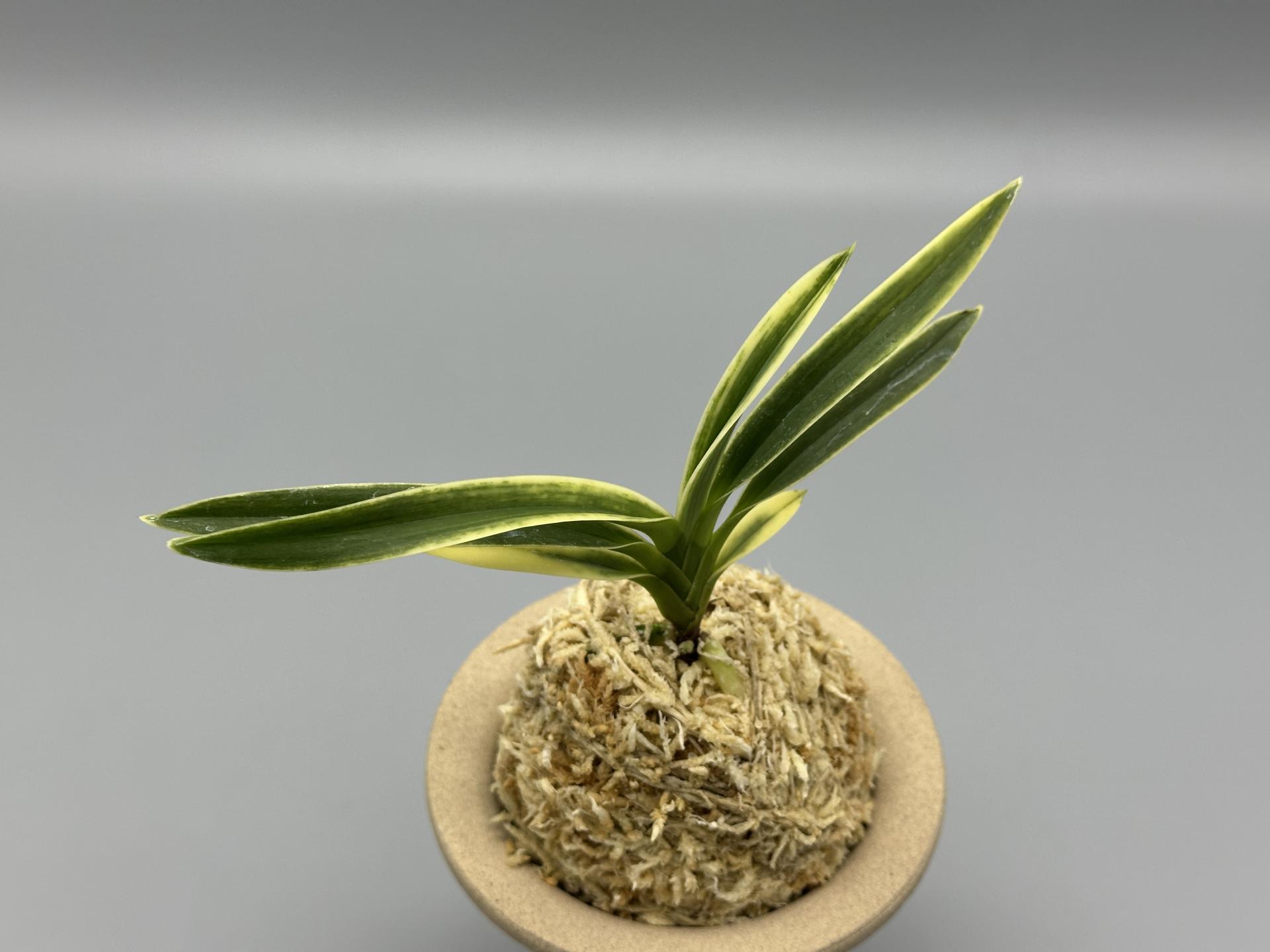 아마미계 실생에서 선별된, '모단 예(牡丹芸)'의 사복륜(絲覆輪) 개체다. 대형 종으로, 짙은 잎은 두껍고, 폭도 매우 넓은 웅대한 모습이다. 천엽은 시기에 따라 백색(白色)의 총산반(總散斑) '모단 예(牡丹 芸)'로 나와, 심대복륜(深大覆輪)으로 녹이 오른 후, 운(雲)을 띄우듯 호반 상(虎斑狀)을 수반, 사복륜(絲覆輪)으로 남는, 독특한 분위기를 가졌다. 잎에는 뚜렷하지는 않으나, 은은한 투성(透星)이 있는 것도 이 난의 특징 중의 하나다. 여러 가지 다양한 예를 가지고 있어 어느 하나를 특징지을 수 없는 매력적인 품종이다. 한국 풍란연합회 신등록 품이다. 니축에 니근으로, 붙음매는 월형이다. |