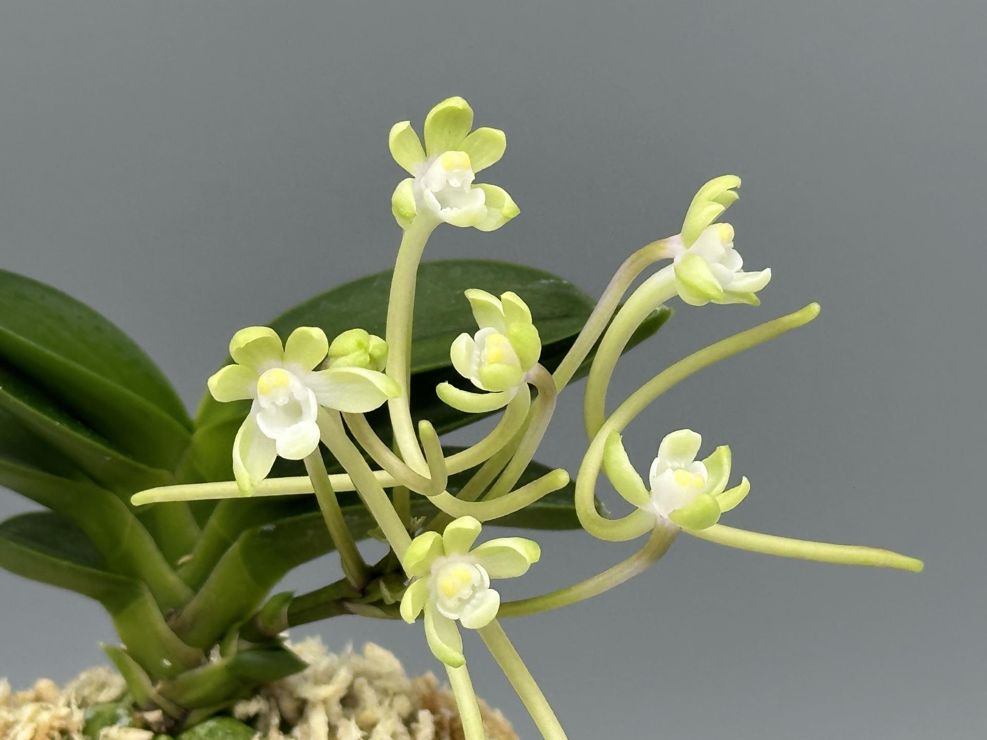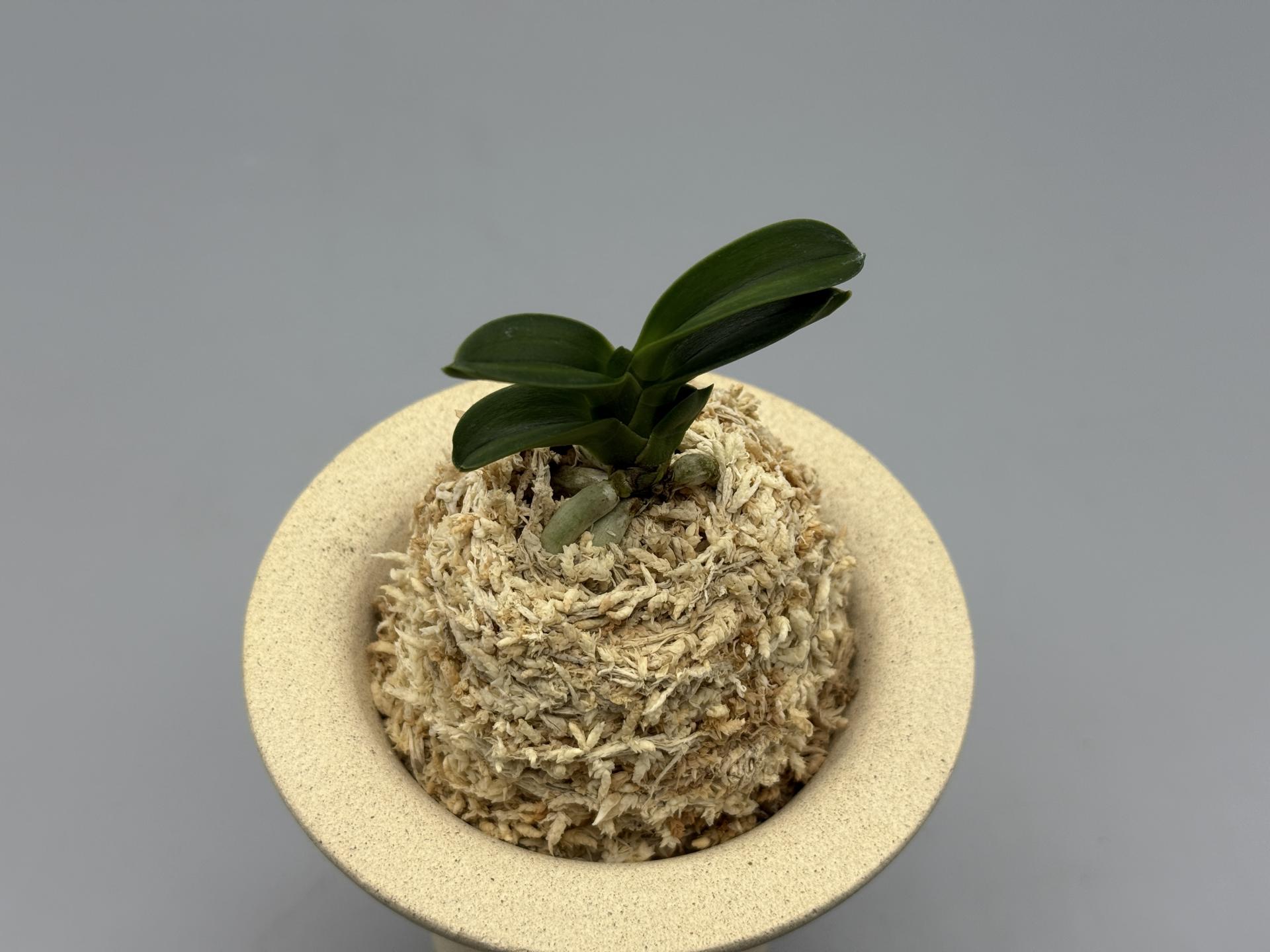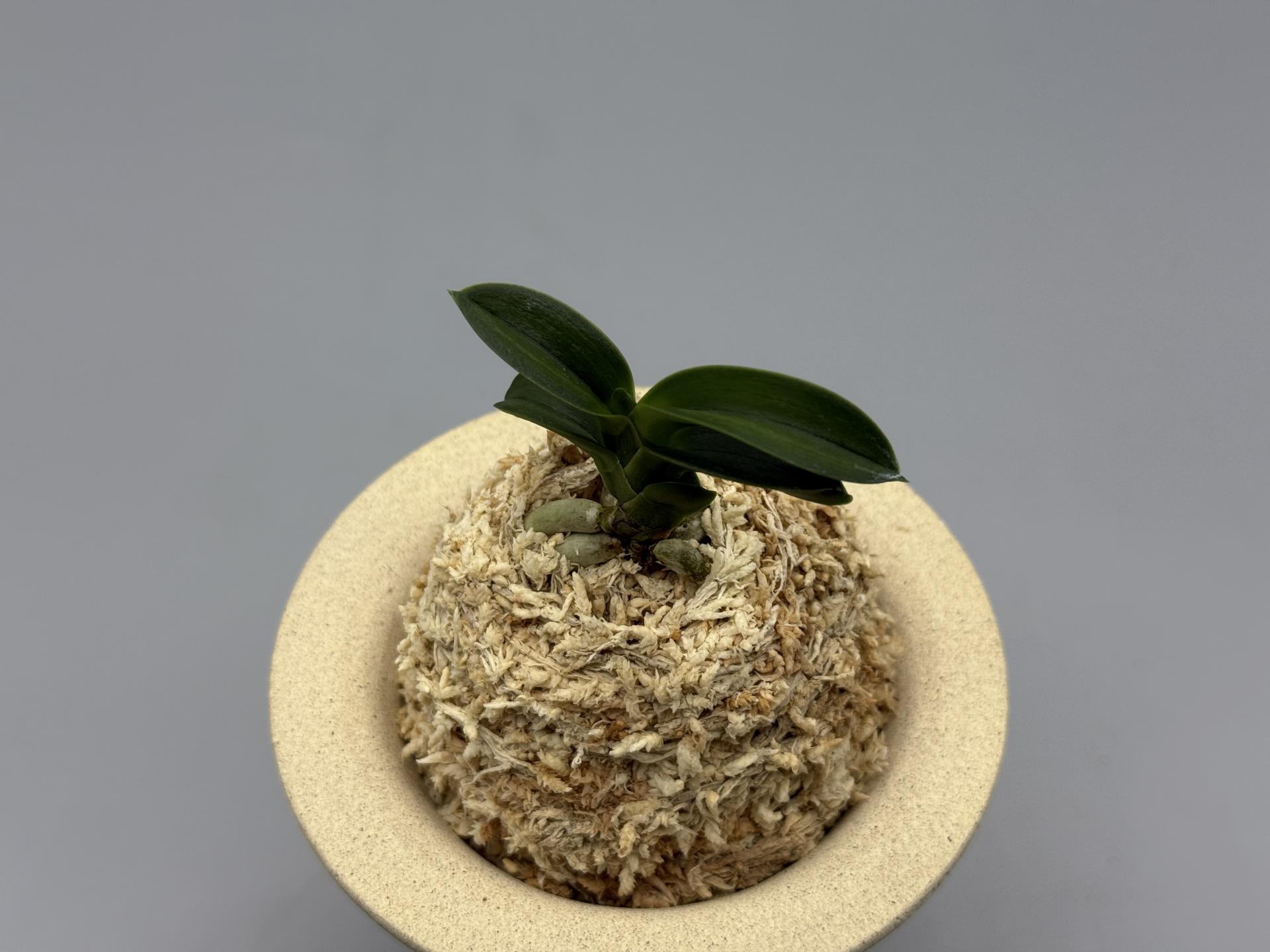 2007년경 '문향원'의 아마미계 풍란 실생에서 나온 두엽의 녹화(綠花)로, 다예(多芸) 품이다. 감성(紺性) 강한 '취선(翠扇)' 형태의 두엽으로, 꽃잎을 푸르게 물들이는 녹화의 매변화(梅弁花)다. 특히 설(舌)이 3개로, 녹색을 띤 중심설(主舌)과 좌우로, 거의 같은 모양의 흰 2개의 부설(副舌)로 이루어진, 다설화(多舌花)의 원판화(圓瓣花)다. 그러나, 거(距)는 주설에서만 굵게 나오는, 깨끗하고 순수한 녹화로 피는 명화다. '화일륜(花日輪)'의 꽃과 유사하나, 한 수준 높은 새로운 스타일로, 녹과 설백(雪白)의 색감이 조화롭게 어우러진, 무척 소심(素心)적인 아름다운 꽃이다. 이 품종은 4배체로 씨앗이 맺히지 않아 실생이 불가능하며, 성장과 번식도 더딘 편이다. 잎은 두꺼운 입엽으로, 축은 굵고, 입 겹침이 단정한 볼륨 있는 모습이다. 니축에 니근으로, 붙음매는 느슨한 일자형이다. |